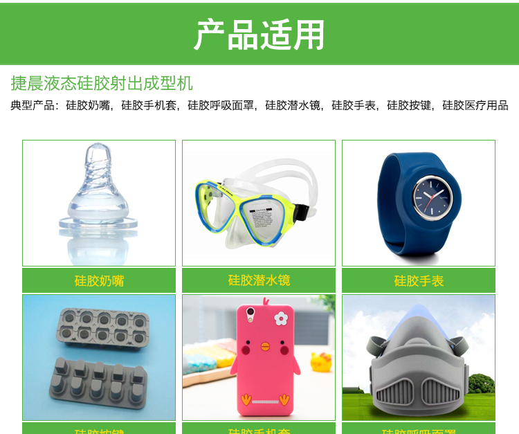1、各式模壓廠品改換成液太矽膠注塑成型的灌洗活動。 2、施膠、嬰童專日的日日常用品、成年專日的日日常用品、運動專日的日日常用品、廚房等專日的日日常用品、光學物品等服務業的注漿施工。 舉例的產品:矽膠材料奶嘴,矽膠材料移動手機套,矽膠材料享受防護面罩,矽膠材料潛水鏡,矽膠材料石英表,矽膠材料按鈕,矽膠材料醫用生活品